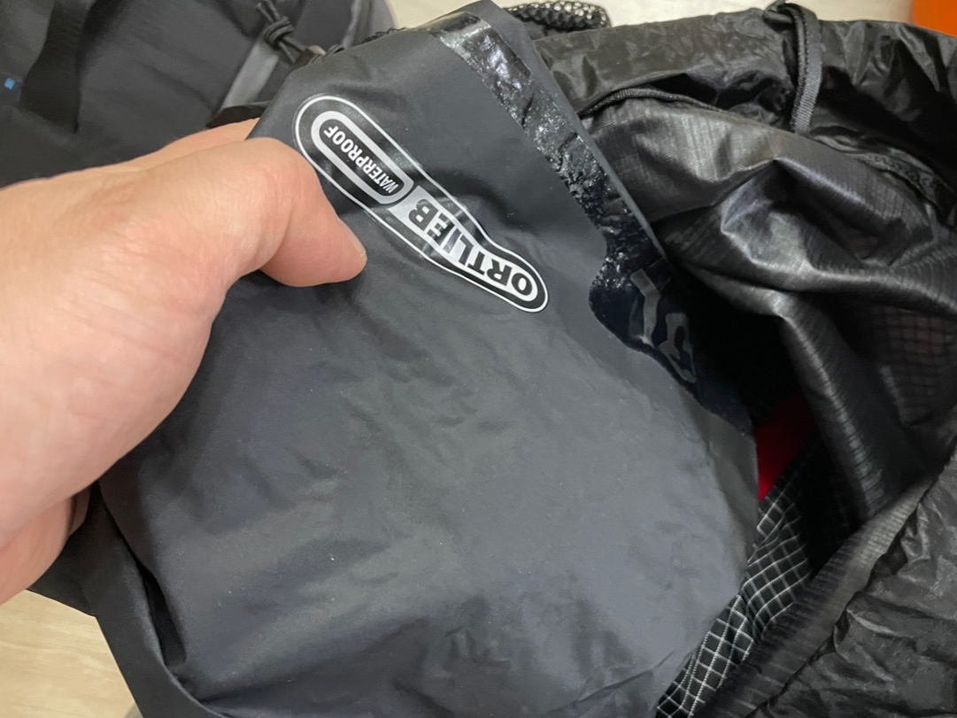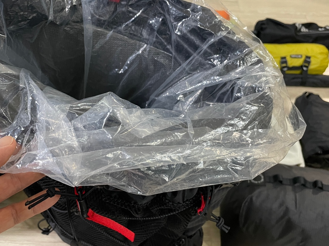 그리고 베개나 우모복을 라이너안에 넣어주는데요. 이유는 침낭이나 기타 용품이 젖었을때 서로 젖지 않도록 하기 위함인데요. 방수가 되는 압축색을 사용해도 되지만 배낭내부를 꽉 채우기 위해 라이너를 사용합니다.