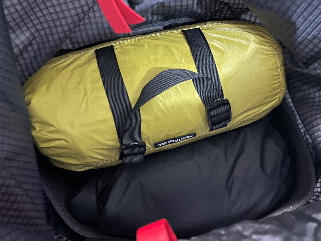텐트와 비슷한 이유로 우모복과 우모바지를 야마토미치 스터프색XL에 패킹하여 배낭 상단에 올렸는데요.